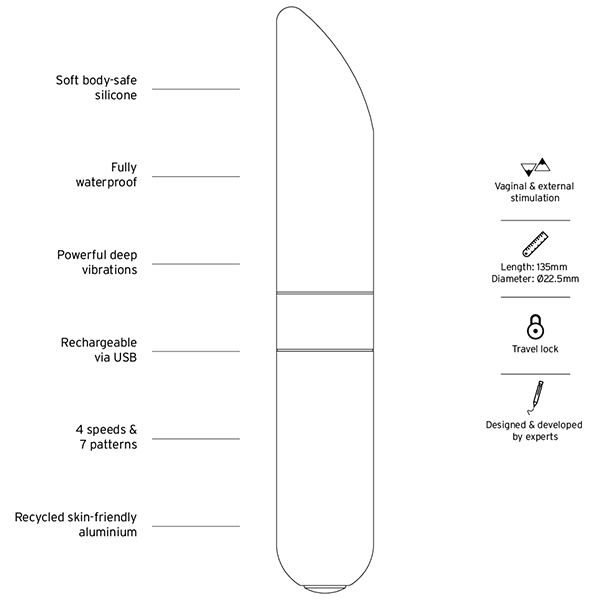 Love Not Warバレットシリーズは、美しいデザイン性とサステナブルであること、どちらも兼ね備えた素材「リサイクルアルミニウム」をベースに作られています。お肌に直接当たる先端部分は、ふんわりとソフトな心地よいシリコン。表面がベタつかず、なめらかですべすべしています。柔らかさを保ちつつもホコリは付きにくく、洗い流してお手入れすることが簡単です。撫でるように繊細な振動から、お腹の中心に向かって響きわたるパワフルな振動、さらに、リズミカルな脈動まで、全10種類のバラエティに富んだ振動パターンを選べます。ボタン一つでシンプルな操作。小型のトイで静音、ポーチも付属のLove Not Warバレットシリーズは、携帯に向いているトーイです。30分以内であれば1mまで浸水可能な完全防水仕様なので、万が一浴槽に落としてしまっても安心。バスルームでも楽しめて、使える幅も広がます。●素材:シリコン、リサイクルアルミニウム、リサイクルABS樹脂、バイオプラスチック●充電方法:USB●充電時間:フル充電2時間●連続使用可能時間:最大1時間●振動パターン:10(振動強弱4段階+リズムパターン6種)●防水:完全防水(IP67)●トラベルロック機能つき※こちらの商品は受注発注商品の為、ご注文から発送までに3、4営業日掛かる場合が御座います。