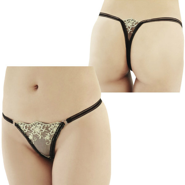 <EROX>シックなブラックカラーにゴールドの刺繍がゴージャスな印象のショーツ。透け感のあるフロントや、Tバック部分にも気を抜かずキッチリと施された繊細な刺繍が、セクシーな大人の魅力を発揮してくれるランジェリー。