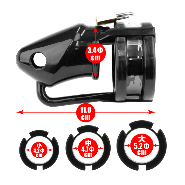 パッケージ:21.0×17.8×5.3cm 本体:全長11.0cm ペニス挿入口内径3.4φcm・リング内径小4.2φcm、中4.7φcm、大5.2φcm セット内容:本体・リング3種(大中小)・ピン・バンド×2・南京錠・プラスチックキー×5・日本語説明書