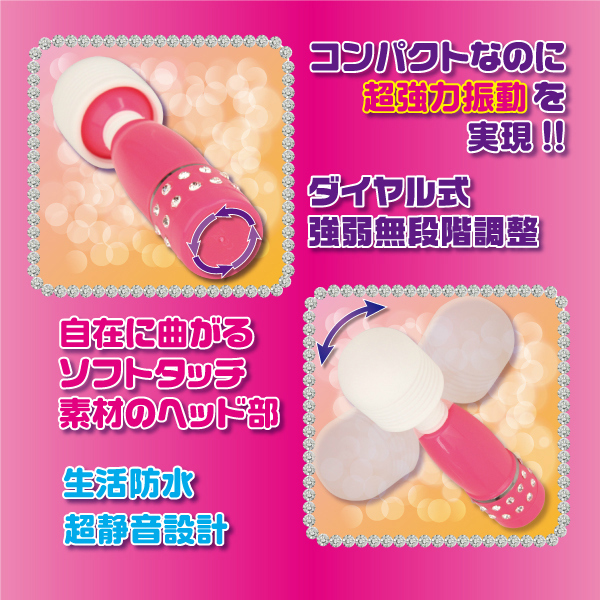 これであなたをお・も・て・な・し!コンパクトなのに超強力パワーを発揮するミニ電マ(ピンク)。持ち手部分は、キラキラストーン付きで女性ウケのいいオシャレな仕上がりになっています。底部を回すだけで動く、誰もが扱いやすいダイヤルスイッチは、無段階調整もラクラクです。また、ヘッド部は上下左右のお好きな方向に曲げられるので、気持ちいいと感じる箇所をピンポイントに刺激できます。生活防水・静音設計、見た目にも使い心地にも申し分のない小型電マです。
