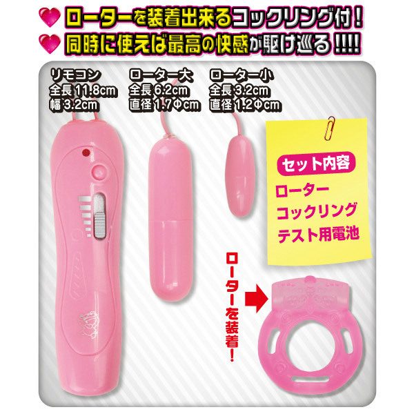 ダブルローターと合体可能なリング付き!同時責めで最高の快感を味わえる「ダブルローターにリング付けちゃいました(笑)」ノーマルタイプ。小型ローターをコックリングにセットし、電動と化したリングをムスコに装着したまま、もう一方のスティックローターで乳首やクリトリスも刺激可能!もちろん、それぞれ単品で使用しても十分楽しめます。