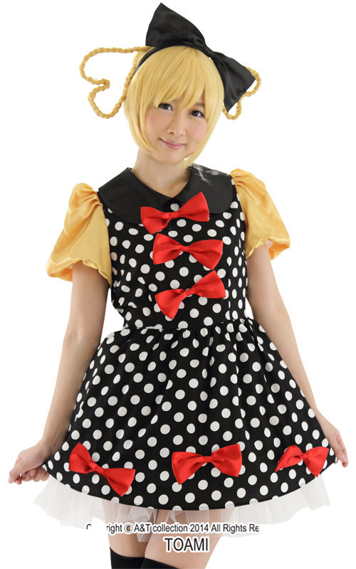 ド派手ワンピとリボンカチューシャで注目度抜群!インパクト大な青文字系アイドル風のワンピース。パニエ付きのドット柄ワンピに、丸襟やパフ袖、赤リボンなどなど、キュートなデザインが大集合!目立ち度100%のなりきりコスチュームです。※ストッキング、ウィッグは付属しておりません