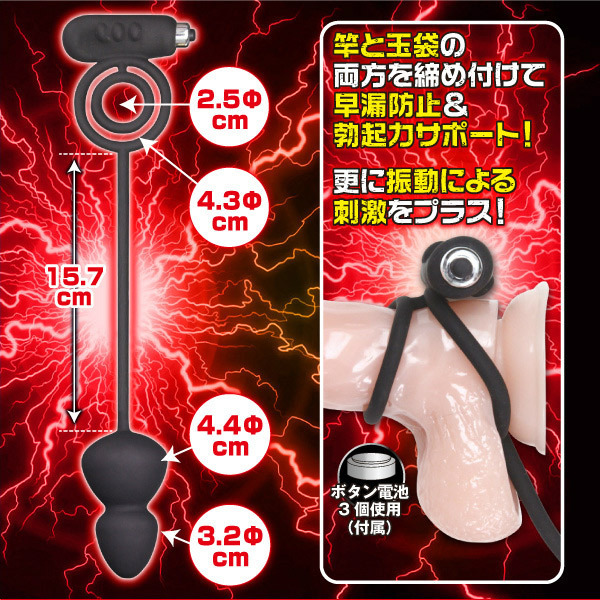 締めて挿れて震わせろ!男のポテンシャルをアゲるプラグ付きリング。●竿と玉袋を締め付けるダブルリング●↑早漏を防ぎ勃起持続をサポート●リング根元にマイクロローター装備●リングの先から伸びるアナルプラグ●↑前立腺を刺激し射精感もUP。自身の持久力を格段にUPさせる二点締め付けリング!さらに前立腺をグイッと刺激するポコポコ形状のアナルプラグもついてダブルの快感に。ローターの振動でパートナーにも快感をプレゼントできる、男のためのお役立ちグッズです。