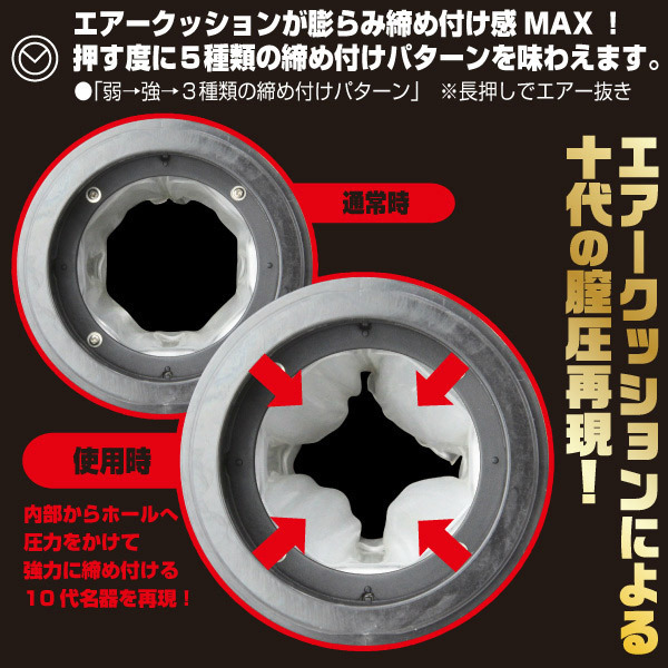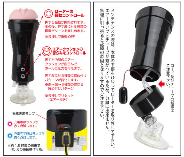 締まり×振動×角度が自由自在に選べる!ボタンのみの簡単操作でギチギチに締め付けるアソコが再現できる使い勝手のいい電動オナホ―ル。●5種類の圧縮モードでリアルな膣圧をコントロール(下ボタン)●8種類のパワフル振動切替え(上ボタン)●下ボタン長押し→エアー抜き●しっかり固定できる強力吸盤付き●便利なUSB充電・約1時間半の充電で45分間の連続稼働●充電中→赤ランプ点滅・完了→青ランプ点灯●オナホール:もっちり柔らか素材・ヒダ→イボ→突起構造●本体から取り外して洗浄すれば繰り返し使用OK。エアークッションのリアルな締め付け感と、内蔵ローターの快感に驚く暇もなく速射する!?一度使うと手離せなくなる電動グッズです。