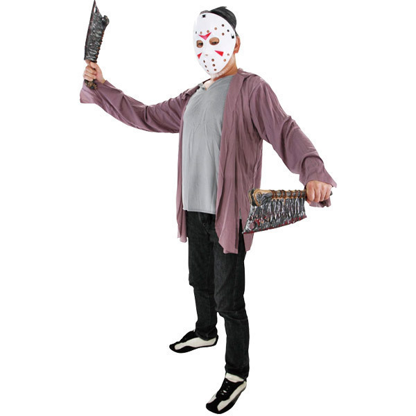 湖畔のキャンプには要注意!あの有名キャラになりきれるホラー衣装セット。●某映画の殺人鬼を思わせるセット●淡いパープルのシャツ風トップス●↑男性でも着られる大きめLサイズ●小さな穴あきのホッケーマスク●↑サイズ不問のフリー仕様。あわせて装備するならチェーンソーではなく鉈(なた)をおすすめしたいホラーコスチューム。女性が着るよりもガッチリ体型の男性に着用してもらいたいハロウィン衣装です。※インナー、パンツ、武器は付属しません※こちらの商品は受注発注商品の為、ご注文から発送まで2〜3営業日掛かる場合が御座います。