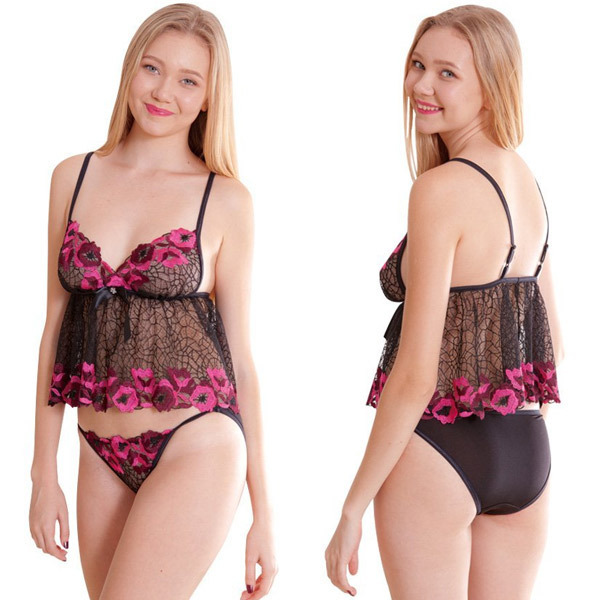 ブラックメッシュにローズカラーの花刺繍!お洒落で大人可愛いミニ丈ベビードール。●胸元・裾・ショーツのフロントに大輪の花を連続で刺繍●ふんわりミニ丈・ウエストがチラ見えてセクシー●肩紐調節可能・背面アジャスター付き●ハーフバックショーツで丸みを潰さず美尻を演出。女性らしい魅力を放つ、ラグジュアリーなランジェリーセットです。