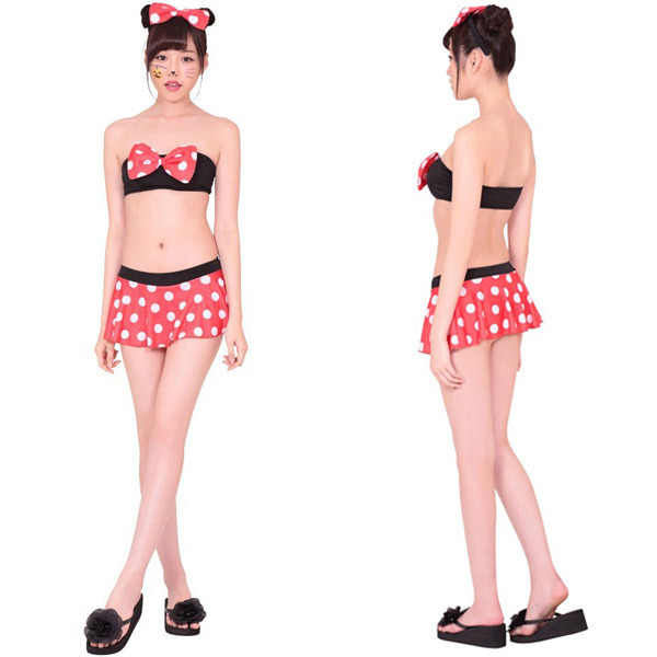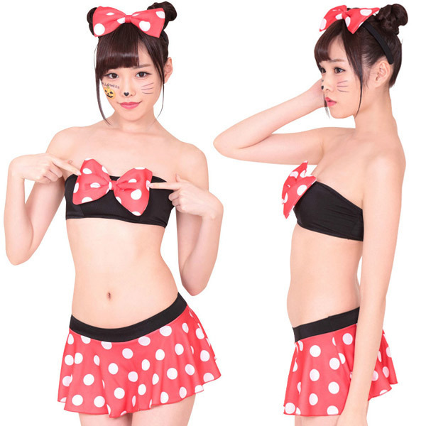 ビーチで注目の的に!キャラクターみたいなドット柄水着コスチューム。●上下セパレートのビキニタイプ●赤・白・黒のビビッドな色使い●黒いチューブブラ×胸元リボン●ドット柄のスカート付きパンツ●お揃いリボンのカチューシャ付●実際に入水することも可能。夢の国のヒロインになった気分を味わえそう!赤×白の大きめドット柄に黒の引き締めカラーが効いているラブリー水着。パンツはフリルスカートと一体型なので気になるヒップ周りも可愛くカバーしてくれます。※セット内容以外は付属しておりません。