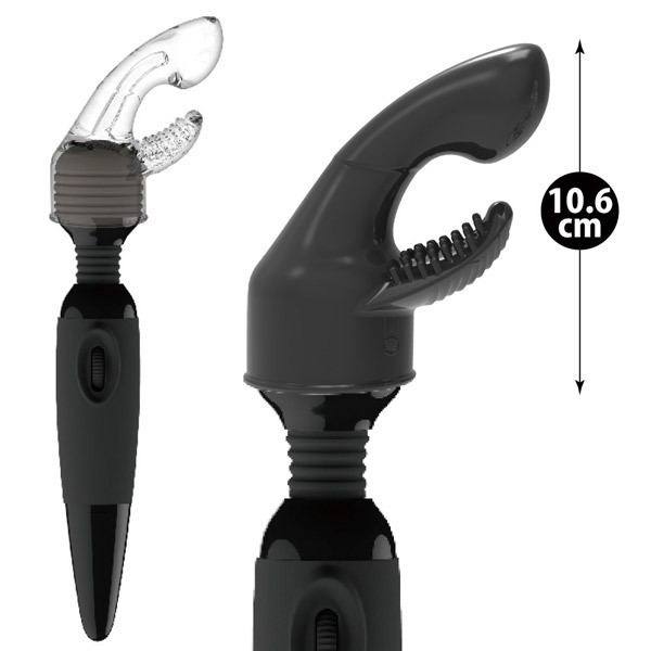 いつものプレイに刺激をプラス!電マに取り付けて使用する専用アタッチメント。●ヘッド径4.5〜5.2cmの電マに取付可能●肌に優しい柔軟エラストマー製●前のめり形状の二か所責めボディ●奥を絶妙に刺激するぷっくり先端●クリトリスに当たるブラシ型突起●ダークな雰囲気のブラック単色。電動マッサージャーの強力な振動を体の中でもしっかり堪能!強烈なバイブレーションを中と外の両側から感じられる電マ専用アタッチメント。絶妙な前傾姿勢で奥までしっかり快感を届けます。エロス漂うクリアカラー(b24910)も。
