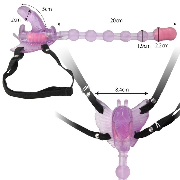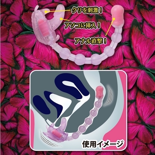 ガッシリ固定で3点同時責め!ベルト固定式のバタフライ型ローター「バタフライエフェクト」。●挿入したままベルトで固定可能●裏側の小突起でクリトリス責め●ペニス型の突起でヴァギナ責め●20cmのロングビーズでアナル責め●柔らかで丈夫なエラストマー素材●ヴァギナとアナル側に強力モーター●7種類の振動パターンを搭載。前も後ろも強力悶絶刺激!奥深くまで響く快感振動のベルト装着型ローター。バタフライのディルド部とアナルビーズ先端にダブルモーターを搭載!ゴム製ベルトでしっかりと固定できるので、装着したまま外出すれば屋外プレイもお楽しみ頂けます。