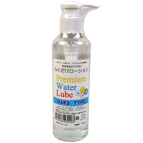 水のように滑らかでもヌルヌル感持続!拭き取るだけの「ふくだけローション Premium Water Lube」。●垂れにくいハードタイプ・180ml●適量を出しやすいプッシュボトル●愛液風のウォーターベース●グッズと相性抜群の硬めテクスチャ●使用後はティッシュで拭くだけ●無香料で自然な潤いの日本製。液垂れしにくいウォーターベースのハードローション。サッと拭くだけでベタつきが残らず後処理も簡単!グッズとの併用や指オナにもぴったりです。【配合成分】マカ・ローヤルゼリー・アルギニン・マリンコラーゲン・プラセンタエキス・アロエエキス。
