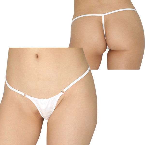 内側に秘密の6連ビーズ付き♪ミニマムな極小フロントがセクシーなホワイトカラーのTバックショーツ。光沢フェリカ生地のフロントはギリギリまで攻めたミニマムサイズ!両サイドとバックは華奢なストリング仕上げ。さらに、内側のセンター部分にキラキラゴールドの大玉ビーズを6個並べた大人のランジェリー!一般的なパールショーツに付いているような丸ビーズではなく、凸凹フォルムの多面体なのでより刺激的に楽しめます。