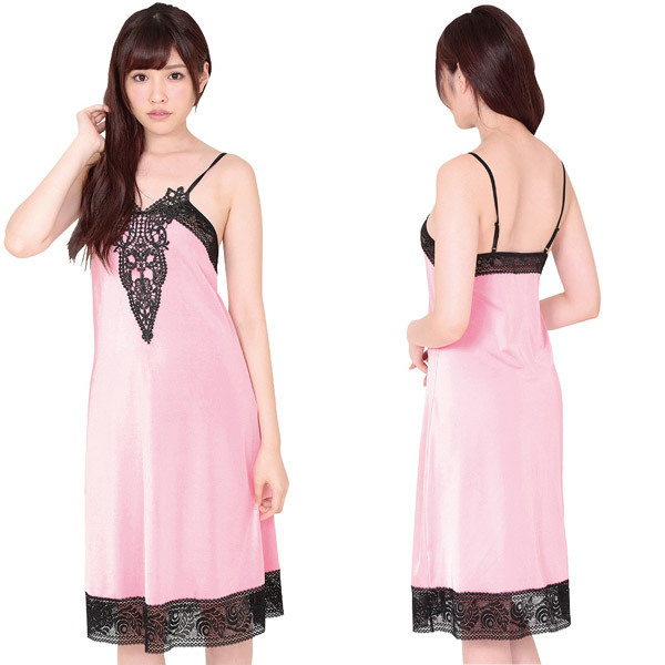 <EROX>ブラックレースとパステルピンクの組み合わせがエレガントなランジェリー「スーパーリッチなピンクスリップ」。大人リッチな長め丈のロングスリップドレス!身頃は心地よい質感の淡いピンクサテン地、デコルテと裾は繊細レースで縁取った切り替えデザイン。やわらかなピンクにブラックカラーでメリハリを付けたセクシーランジェリーです。