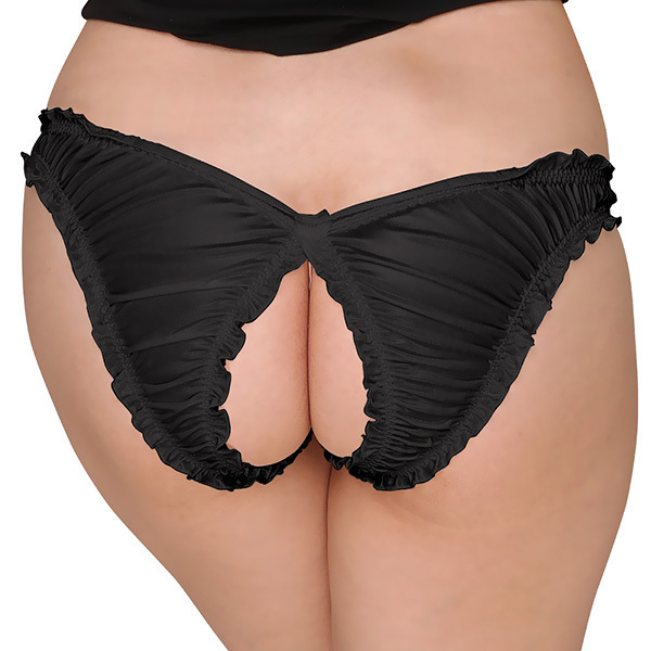 お尻側が蝶のようなシルエットになったフェリカ&レース地の日本製ショーツ。大人の色気を漂わせたカラーとデザインながらも、生地のクシュッと感で可愛らしい印象も受けますね♪フロント部分は少し透け感のあるレース地になっていて、周囲には花柄をあしらいエレガントさを演出。クロッチ部分はなんとそのまま挿入可能な股割れ仕様で、そのままお尻の方まで大胆にカット!ナイトプレイに最適な一着となっています。