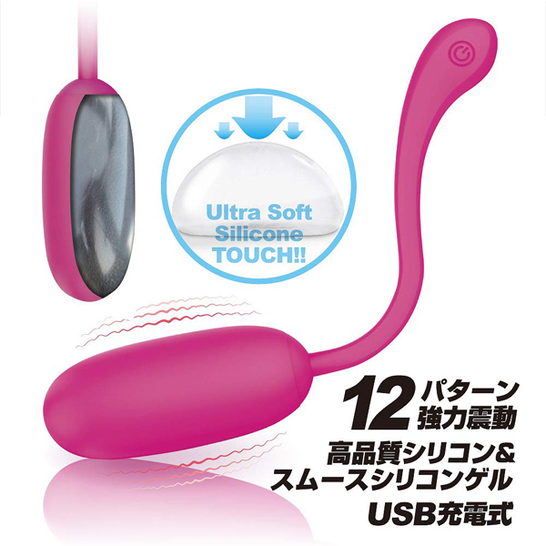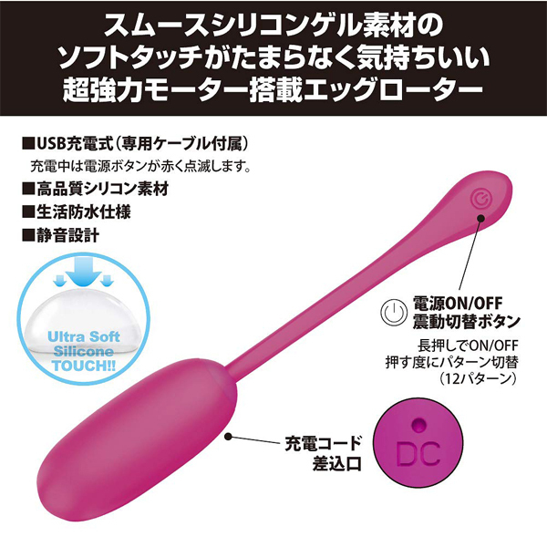 側はサラッとしたシリコン、内側は柔らかなスムースシリコンゲル素材を使用した、ソフトタッチがたまらなく気持ちいい超強力モーター搭載エッグローター!柔らかな優しい挿入感、しかし震動は超強力でGスポットへと快感が響き渡ります。挿入したままテールの先端にあるボタンで操作が可能。●高品質シリコン+スムースシリコンゲル素材●12パターン強力震動●静音設計●生活防水●専用USB充電コード付属
