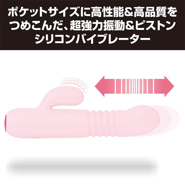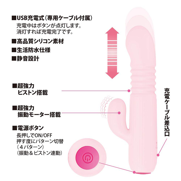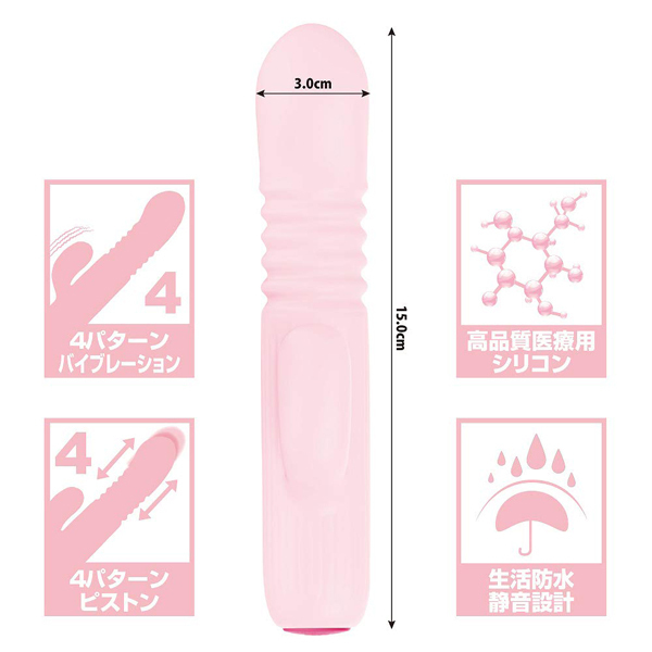 ピストン+振動。超強力振動と力強いピストンでポルチオ直撃の超絶快感!ハイスペックを小さなボディに詰め込んだ究極のピストンマシーン!ボタン1つで簡単操作可能●4パターン震動+ピストン●メディカルグレードシリコン●生活防水●USB充電式(コード付属)