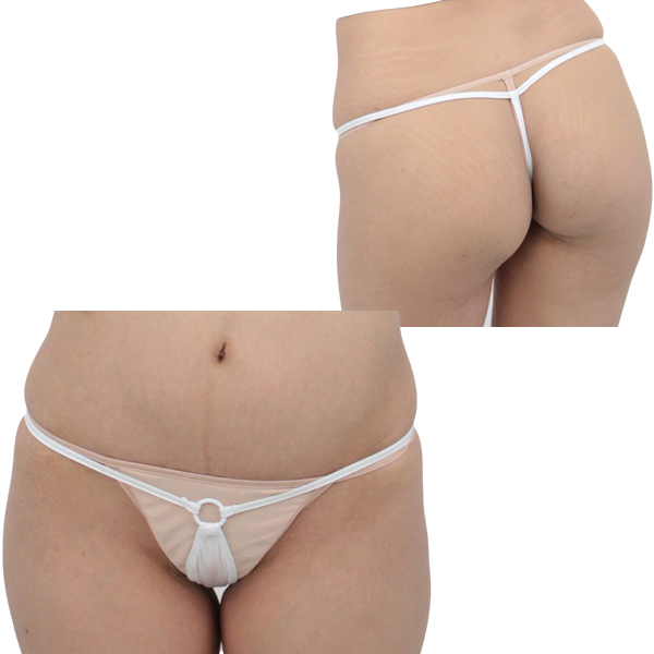 肌触りの良い生地が心地よくフィットするホワイトカラーの日本製Gスト。ゴム紐と股布を中央のリングでジョイントしたデザイン!生地面積が狭いため、ボトムス着用時にラインが気になるという場合にも最適です。Mサイズ