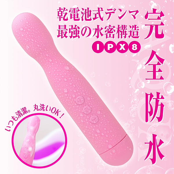 当てても入れてもOKなシリコン製の完全防水式デンマ(電池式)。ヘッド幅3.4cmと細く挿入が可能で、IPX8等級仕様なので入浴しながら使いたい方にうってつけ!強弱は12段階、リズム振動は10パターン搭載♪多彩なアクションながらも3つのボタンで簡単操作!31mmアタッチメントに対応した中イキ派&外イキ派も満足できる逸品。単4電池を4本使用、ピンク