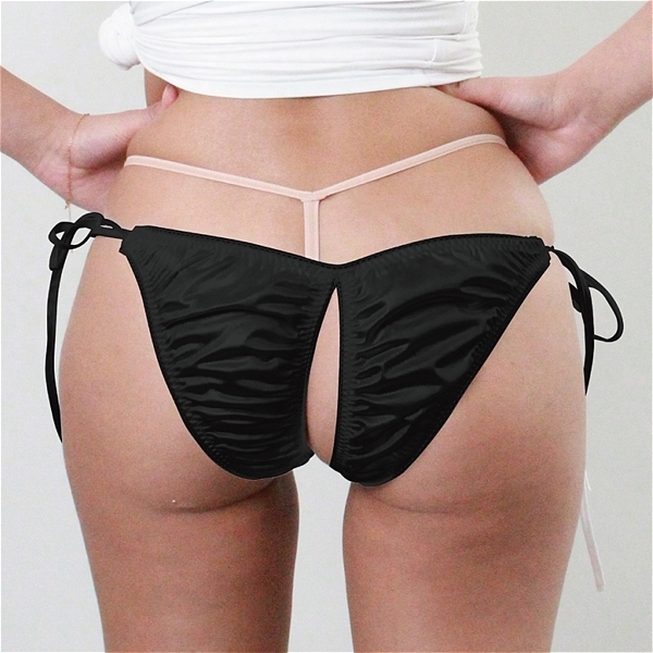 光沢が有り肌触りの良い生地にレース付き脇ヒモ股ワレFB Lサイズ ブラック