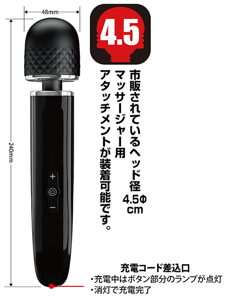 パッケージ:25.0×7.0×5.5cm 本体:全長24.0cm・ヘッド径4.8cm USB充電式
