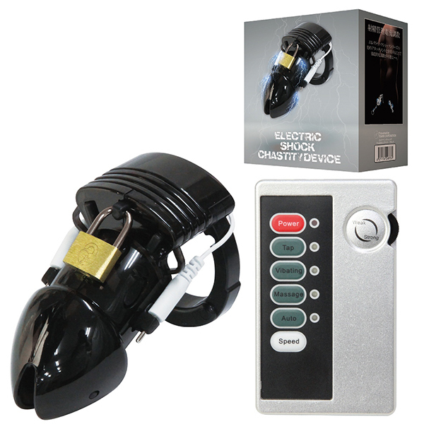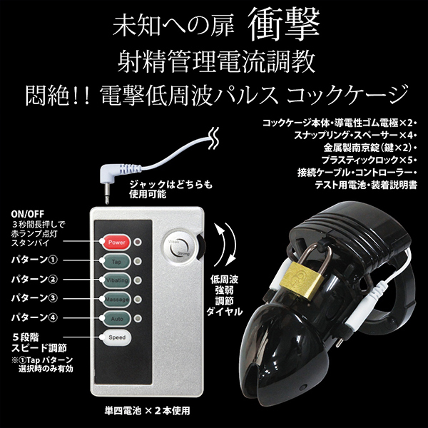 低周波刺激をプラスしたことで、これまでの貞操帯の常識を覆す「エレクトリックショック チェステティデバイス」。使えば悶絶すること間違いなし!?射精管理に電流調教をプラス♪軽量なプラスチック素材の貞操帯で、電撃低周波パルスコックケージだからビクンビクンと脈打つ刺激的な低周波パルスがお楽しみいただけます。機能面は4パターンのパルスパターンに5段階のパルススピード!これさえあればCBTプレイがもっと過激に楽しめちゃいます♪こちらはブラックカラーになります。【単四電池×2本(付属)】