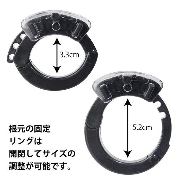 パッケージ:10.5×12.0×7.0cm 本体:ケージ内径3.2〜3.5cm・亀頭部の内径4.0cm・固定リング内径3.3〜5.2cm セット内容:コントローラー、コックケージ本体、導電性ゴム電極×2、スナップリング、スペーサー×4、金属製南京錠(鍵×2)、プラスティックロック×5、ケーブル 電池:単四電池×2本使用