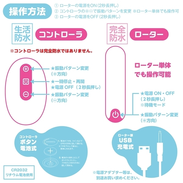 パッケージ:17.5×10.5×3.5cm 本体:ローター7.8×2.0cm・コントローラー5.6×3.5×1.5cm 電池:本体(USB充電式)、リモコン(ボタン電池CR2032)
