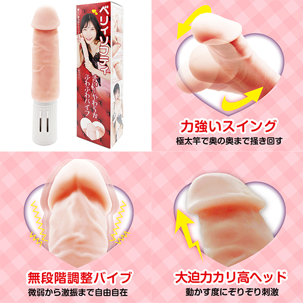 大きくたくましいボディとチョーやわらかふわふわなバイブ「ベリィソフティ」大迫力のカリ高ヘッドと、極太の竿が力強いスイングで奥の奥まで掻き回す!最大の特徴は、とっても伸びる優しい弾力のマシュマロスキン。ふわふわもちもちな感触は敏感な部分を刺激することでも楽しめます。スイングとバイブがそれぞれ無段階調整可能。お好みの強さに合わせてお使いいただけます。竿は少しの力で曲げることができるため、角度を調整して快感ポイントを狙い打ちに。大きさ・性能ともに満足感抜群のバイブです。