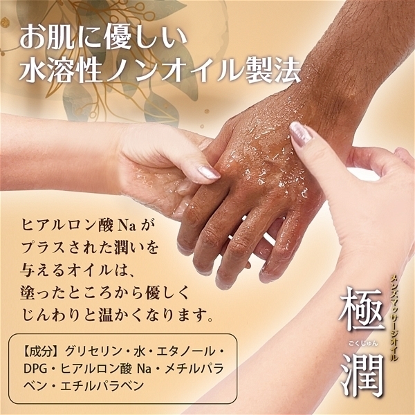「最上級の潤い」、「最上級の滑らかさ」、さらに「最上級の使いやすさ」を追い求めて完成したマッサーオイル「極潤」。保湿に優れたグリセリンに加えヒアルロン酸Naを贅沢に配合することで使用後はもっちりぷにぷにしたお肌に仕上がります。熱伝導に優れた温感タイプなので塗った瞬間からじんわり温かく感じます。※成分上、舐めると甘く感じますが飲み物ではございません、飲み込まないようにご注意ください。大変滑りやすいので足元にこぼさぬようご注意ください。ボトルタイプ