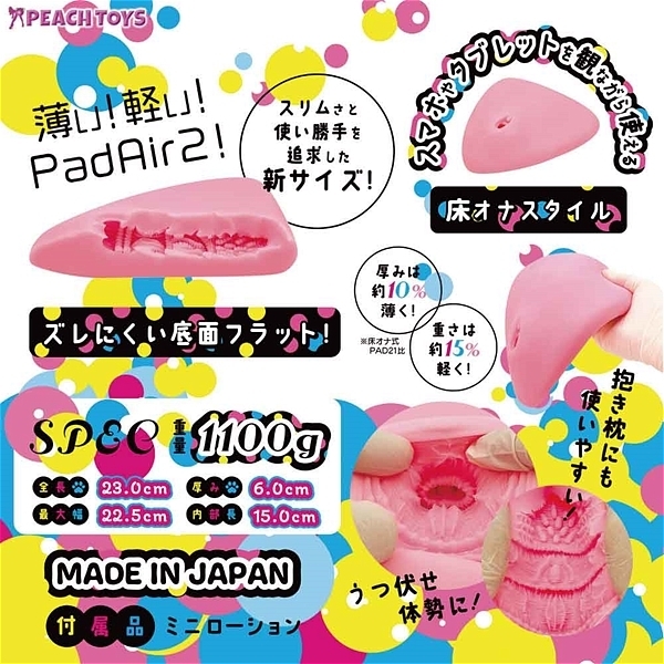 床オナ式PAD Airに新しく「PAD Air 2(パッドエアーツー)」誕生!!厚みは約10%薄く、重さは約15%軽くいたしました(床オナ式PAD21比)が、快感と安定感はそのままに仕上げました!穴全体形状は、既存の床オナ式PADと遜色のないサイズ感で、内部構造はヒダが無数に配置された名器系構造です。