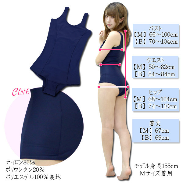 Mサイズ:B66〜100cm・W50〜82cm・H68〜104cm 着丈67cm セット内容:水着単品(一部裏地付き) 素材:ナイロン80%、ポリウレタン20%、裏地:ポリエステル100%