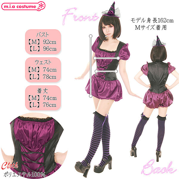ハロウィンパーティにもってこい♪ダークポップに仕上げた可愛い魔女コスプレ大きめサイズ。光沢のあるサテン風の生地を使用したサロペットに、三角帽子が付いたカチューシャのセット商品♪パフ袖や丸みのあるかぼちゃパンツがとってもキュートなデザインです。元気な魔女っ娘になりきってハロウィンを楽しもう!※塩素系漂白剤による漂白不可、洗濯の際はリボンなどの付属品を外し個々単独での手洗いをお願いします、色落ちの可能性があります。※こちらの商品は在庫の状況によりお届けまでに4日〜7日程度かかる場合がございます。