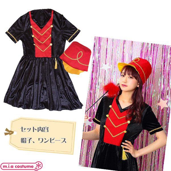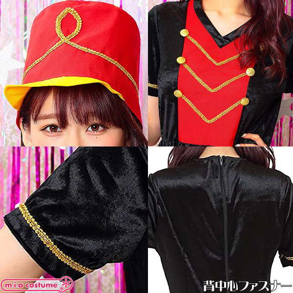 演奏会の衣装やイベント行事に!光沢のある柔らかな生地を使用した赤×黒のマーチングガールコスプレ。黒ベースのV字ネックワンピに赤を加え、金の装飾を施したクラシックなデザイン!大きく高さのある帽子を被れば貴女も立派なマーチングガールに変身♪背面ファスナー式で裏地はありません◎Fサイズ※洗濯不可、塩素系漂白剤による漂白不可、アイロンは中温で当て布使用、ドライクリーニング不可※こちらの商品は在庫の状況によりお届けまでに4日〜7日程度かかる場合がございます。