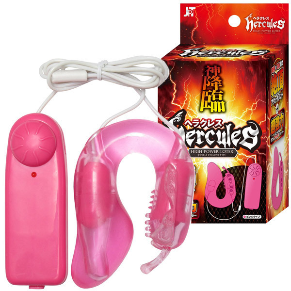 Gスポット&クリトリスを同時責め!究極刺激の二股アタッチメント付きダブルローター「ヘラクレス」ピンク。ツノ&イボ付き側でクリを責めながら、反対側を挿入してGスポも刺激できるU字型アタッチメント付き。バイブレーションは無段階調節が可能!ソフトな弱振動の焦らしプレイから、圧倒的な強力振動の2点責めまで思いのまま。アタッチメントは取り外せるのでお手入れも簡単です。単三電池×2本付属。