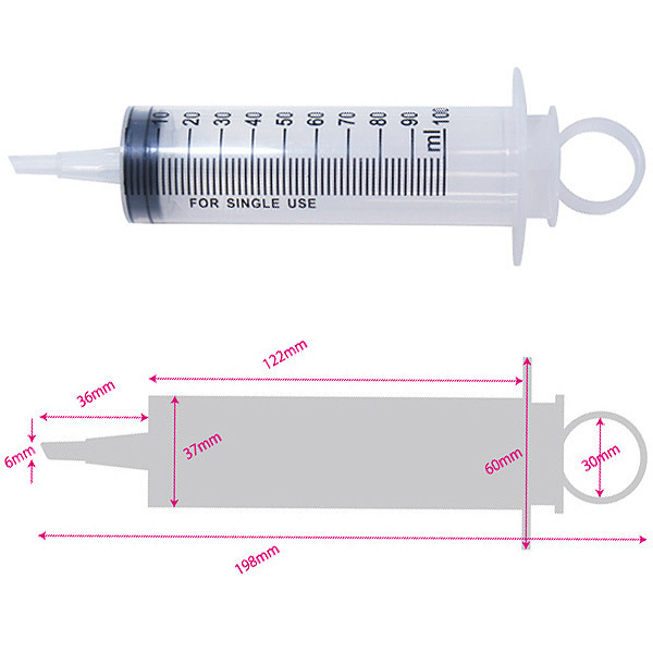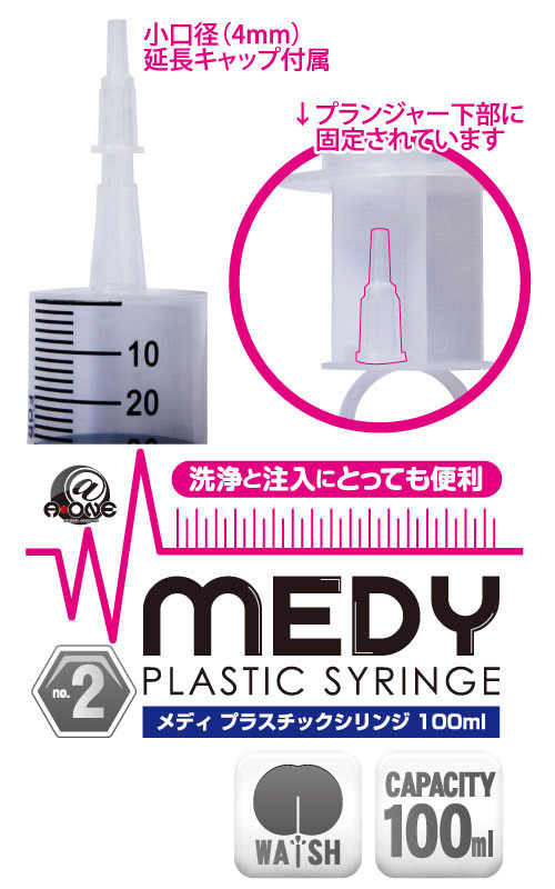 片手でもラクラク注入♪アナル洗浄や注入など、幅広い用途に使える万能プラスチック製シリンジ。●医療系グッズのMEDYシリーズ●お手軽なプラスチック製●容量たっぷりの100ml●注入量が一目で分かる目盛り入り●片手でも簡単に注入できるリング付き●小口径の延長キャップも付属。付属の延長キャップを装着すれば、初心者の方でも使える小口径4mmに早変わり!延長キャップはプランジャー下部に固定されているので保管の際も安心です。