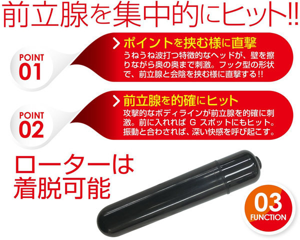 うねうねボディが興奮を煽る!見ているだけで疼いてしまいそうなワイルド系エネマグラ。●ややS字のようなフック型形状●複雑なうねり満載の凹凸ボディ●腸壁を刺激しながら奥まで進む●前立腺と会陰を挟むような構造●ヴァギナ使用でGスポ責めにも●ローター部分は取り外し可能●底部ボタンで3段階に調節OK。ひと目見ただけでわかる刺激度満点なデコボコラインが魅力のエネマグラ。アナルはもちろんのこと、ヴァギナに使えば敏感部分に絶妙ヒット!計算されたフック型ボディがポイントです。※電池周りの保護用シートは外さないでください。