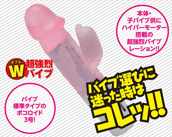 超強烈ダブルモーター搭載!ポコロイドシリーズのバイブレーター。●クリアピンクの定番フォルム●Gスポを擦り上げるカリ高仕上げ●平らなベロ付きクリバイブ●本体中央+子機のWモーター仕様●振動調節は無段階スライド式●安心品質の日本製。振動機能のみのスタンダードタイプながら、ハイパーモーターをダブルで備えた「ポコロイド」シリーズの3号で、奥まで響く超強烈なバイブレーションをお楽しみください。