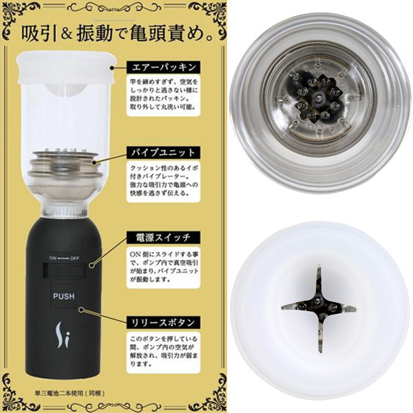 吸引&振動で亀頭責め!バキュームカップ型の電動オナホール「グランストライカー」。●ON/OFFのみの簡単スライド式スイッチ●電源ONでシリンダー内の吸引&振動開始●クッション性のある内蔵イボが亀頭責め●先端の押し付け具合で刺激を調節可能●取外し&丸洗いできる柔軟エアパッキン●エアリリースボタンで吸引圧力を解除可●単三電池×2本付属(動作確認用)。吸引で感度がアップした亀頭への振動に悶絶必至!先端をビンビン刺激できる電動オナニーグッズ。挿入時にローションを塗ってからご使用頂くと空気漏れしにくくなります。※電池を交換する場合は、アルカリ電池をご使用ください。