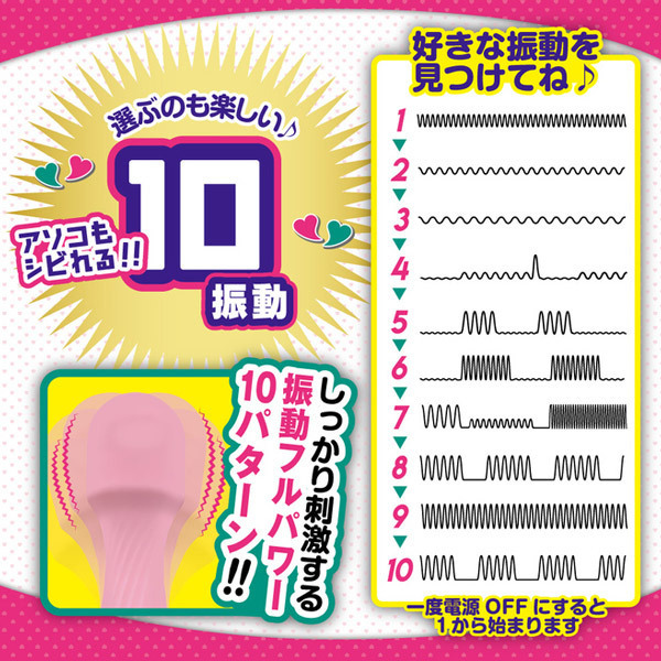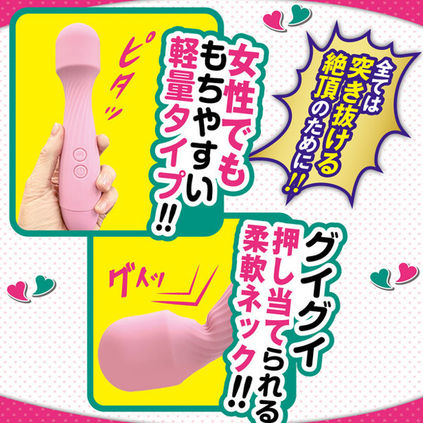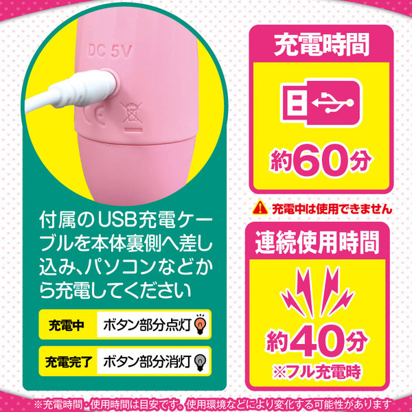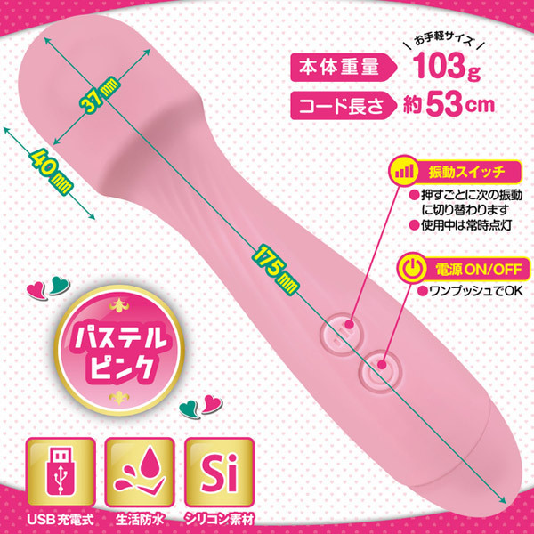 可愛い見た目でビリビリ痺れる強力振動!女性でも持ちやすい重量103gの軽量型USB充電式電マ。ピンク色の柔らかなシリコンで覆い生活防水加工を施した可愛いデザイン!当てても痛くなりにくく、濡れてくれば挿入も可能◎10種類の振動を搭載しながら操作はシンプルで初心者さんでも簡単。首元は柔軟なフレキシブルネック仕様!充電1時間で最大40分使用可。充電ケーブル付