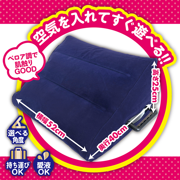もうちょっと腰の位置が高かったら…もう少し彼の身長が高かったら…彼女がもう少し上付きだったら…このもうちょっと…を解消してくれるのが、三角形でグリップ付きのエアクッション「ラブポジクッション」!置き方次第で急角度とゆる角度を選べます。この角度がお互いのカラダに負担をかけることなく、二人のもうちょっと…をサポートしてくれます。空気を入れたらすぐ遊べて、汚れたらサッとひと拭き。たためば持ち運びにもラクラクなコンパクトなサイズに。収納にも場所を取りません♪ベロア調素材で見た目スタイリッシュなのでそのまま置いていてもインテリアとして馴染みます。マンネリ防止にも効果的絶大。このラブポジションでふたりだけのポジションを見つけてね。今まで以上のフィット感をパートナーと一緒に感じよう♪