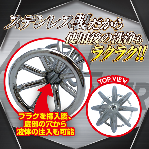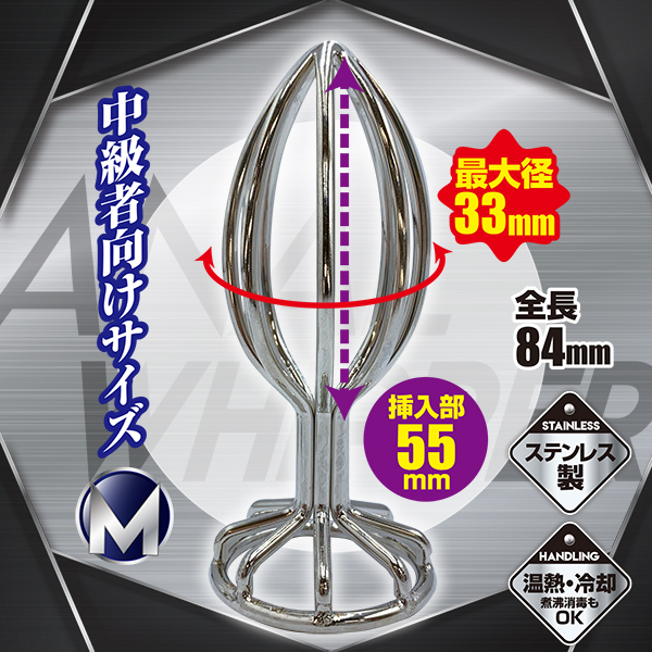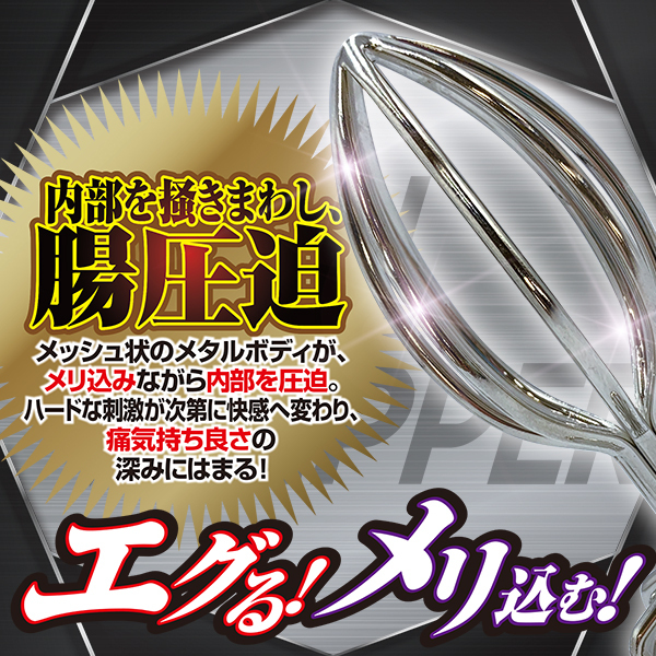 エグる!メリ込む!内部を掻きまわし、腸圧迫!メッシュ状のメタルボディがメリ込みながら内部を圧迫。ハードな刺激が次第に快感へ変わり痛気持ち良さの深みにハマる!プラグを挿入後、底部の穴から液体の注入も可能!ステンレス製なので温熱・冷却しての使用、煮沸消毒もOK♪使用後の洗浄もラクチン。磨き上げられたメタルボディでハードにエグれ!!!Mサイズは中級者も納得!