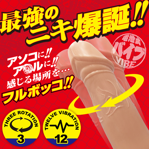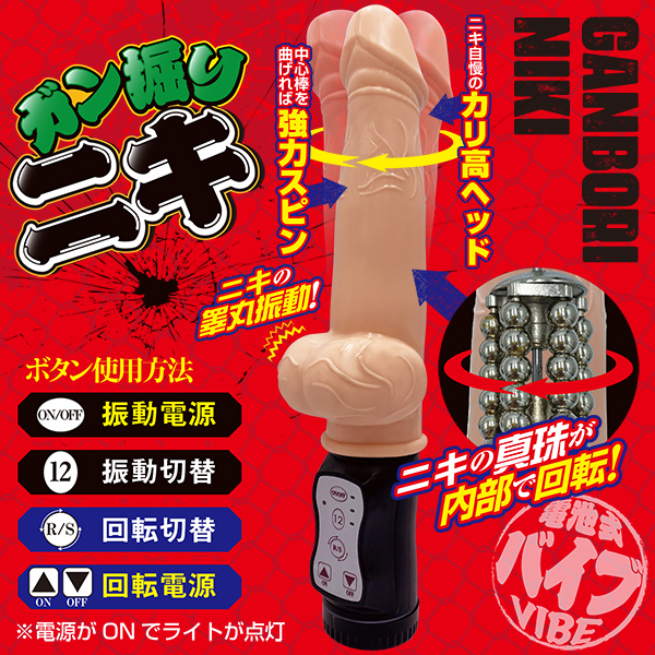 荒ぶるニキのペニスで掘られる快感を堪能せよ!アソコにもアナルにも使えるカリ高ヘッドが特徴のバイブ「ガン掘りニキ」♪感じる場所をフルボッコする最強のニキが遂に爆誕!挿入せずにはいられないリアルな漢のイチモツ風のデザインが何とも凛々しいカリ高バイブ♪竿の回転と睾丸部分の激振動でナカもソトも刺激してイカせてくれる!カリの張り出しが効いたヘッドは3段階のスイング機能を搭載♪タマ部分に内蔵したモーターは12種類のパターンを搭載し、パールの回転と合わせて充実した刺激を味わわせてくれます!電源は単4電池3本となっています。