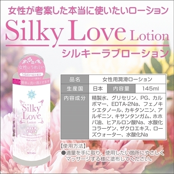 「肌になじみやすい」「潤い・保湿が欲しい」「コスパ高がいい」etc.そんなユーザーの想いを実現するために女性が考案したのがシルキーラブローション。コラーゲンやヒアルロン酸など肌に嬉しいうるおい成分に加えホホバ油を配合することでお肌へすっとなじむ仕上がりに。カキタンニンによる消臭効果も期待でき、さらに使用後は簡単に洗い落とすことができます。本当に必要な成分・性能を厳選した無色透明の中粘度ローションです。<成分>精製水、グリセリン、PG、カルボマー、EDTA-2Na、フェノキシエタノール、カキタンニン、アルギニン、キサンタンガム、ホホバ油、ヒアルロン酸Na、水銀化コラーゲン、ザクロエキス、ローズウォーター、水銀化Na