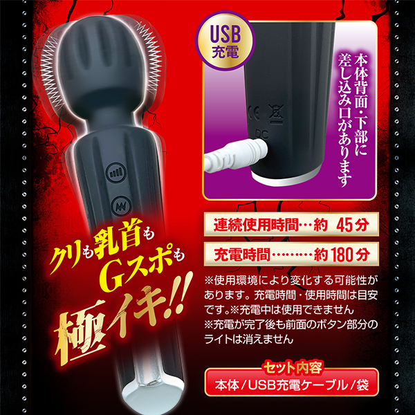 爆イキすぎてエグいッ!悪魔級のシビレ振動を体験せよ!!スタイリッシュな見た目と、軽量でありながら最強の振動の小型デンマ。全てワンプッシュで操作が行えて簡単。一体型の小ヘッドで、ネック部分は柔軟性も十分なので強く押し当ててOK!濡れてきたら挿入もOK!手触りのよいさらさらボディは、汚れたらサッと洗い流せるオールシリコン。多彩で過激な爆振動は20パターンもあり、プラスしてさらに3段階の強さも楽しめます。普通のデンマじゃ物足りないアナタへおすすめ。・シリコン素材・生活防水・USB充電式■充電時間:約180分■連続使用時間:約45分※使用状況や環境により時間が変わる場合があります。