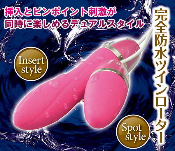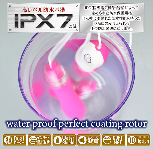 なんと30分間水没させても浸水しないという、国際基準IPX7をクリアした驚異の防水性能を誇るダブルローターです。挿入して楽しめるインサートスタイルと、ピンポイントに当てて楽しめるスポットスタイルのヘッドは、それぞれ形が異なるのでクリに当てながら挿入したりといった使い方も可能♪振動パターンは10種類でトルクフルな強力振動はきっとクセになること間違いなし!肌触りの良いさらさらマット加工は、女性が心地よく感じること請け合いで、最新技術のウォーターシールド加工が施されているから、本体もコントローラーも水に入れても浸水しませんよ♪こちらはシックなブラックカラーになります。※単四電池×2本付属