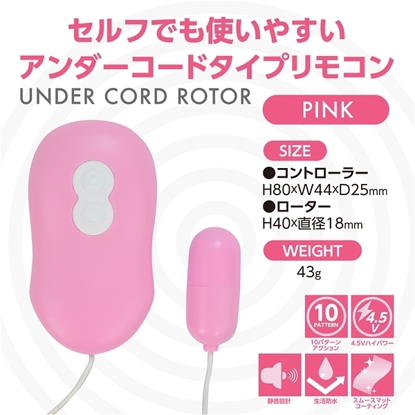 コントローラーの下側からコードが出ているためセルフプレイ時も通常時もコードの煩わしさが軽減されたスタイリッシュデザインのローターです♪握れば分かる使いやすさがウリで、他にはない使いやすさを重視したアンダーコードスタイルが特徴!単四電池3本を使用した4.5Vの強力振動マイクロモーターが搭載されていて、小径ローターで可愛いカラーバリエーション、さらにはマット加工を施すことで上質感を極めた新型ローターです♪10パターンの振動を備え、ハイパワーの4.5V仕様!生活防水仕様なのでローター本体の水洗いもできてローター部分はマット加工だから当て心地も良好♪10パターンアクションをワンプッシュで簡単にONOFF操作が可能です。パステル系で4種類のカラーバリエーションでこちらはピンクになります。