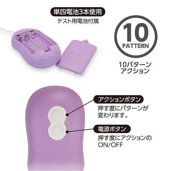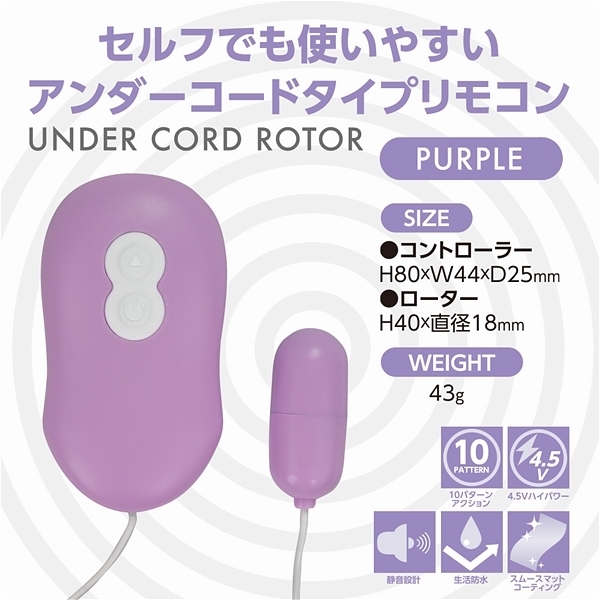 コントローラーの下側からコードが出ているためセルフプレイ時も通常時もコードの煩わしさが軽減されたスタイリッシュデザインのローターです♪握れば分かる使いやすさがウリで、他にはない使いやすさを重視したアンダーコードスタイルが特徴!単四電池3本を使用した4.5Vの強力振動マイクロモーターが搭載されていて、小径ローターで可愛いカラーバリエーション、さらにはマット加工を施すことで上質感を極めた新型ローターです♪10パターンの振動を備え、ハイパワーの4.5V仕様!生活防水仕様なのでローター本体の水洗いもできてローター部分はマット加工だから当て心地も良好♪10パターンアクションをワンプッシュで簡単にONOFF操作が可能です。パステル系で4種類のカラーバリエーションでこちらはパープルになります。