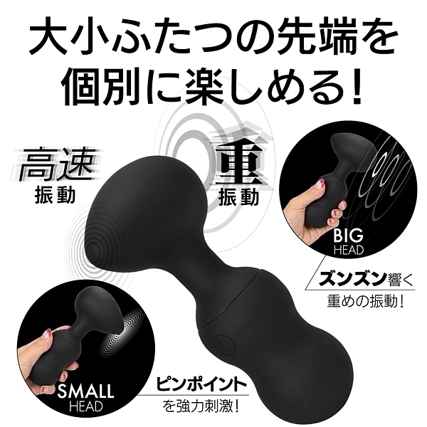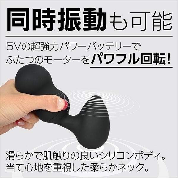エッグ型ヘッドの左右に大小、サイズの違うモーターを配置!小ヘッドにはピンポイント用に微細振動モーターでポイント刺激を楽しめます。大ヘッドには重振動の大型モーターを搭載してデンマのダイナミックな振動を体感出来ます。電圧5Vの強力振動+高品質なオールシリコンボディだから触り心地も非常に滑らかで防水性能も完全防水を実現(防水等級IPX7)当て心地の良さを上げるフレキシブルネックの反発度にもこだわった絶品デンマです。さらに二つのモーターを個別操作出来るのでお好みに合わせて色々な楽しみ方が出来ます。もちろん同時振動も可能なので共に最強振動にした時のパワーは圧巻です。強弱も5段階に微調整が出来るので振動の好みに合わせて楽しめます。さらに5つのパターン振動も内蔵。満充電120分で最大60分使用可能。(使用環境により大幅に増減します。)●カラー:ブラック