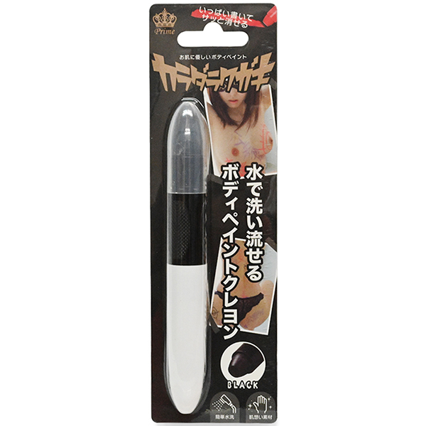 肌に優しいラクガキクレヨン<カラダラクガキ>に便利な単品パッケージが新しく登場しました。プレイを盛り上げるラクガキが自在に楽しめて、水で簡単に洗い流せます。肌に相性抜群のブラック。