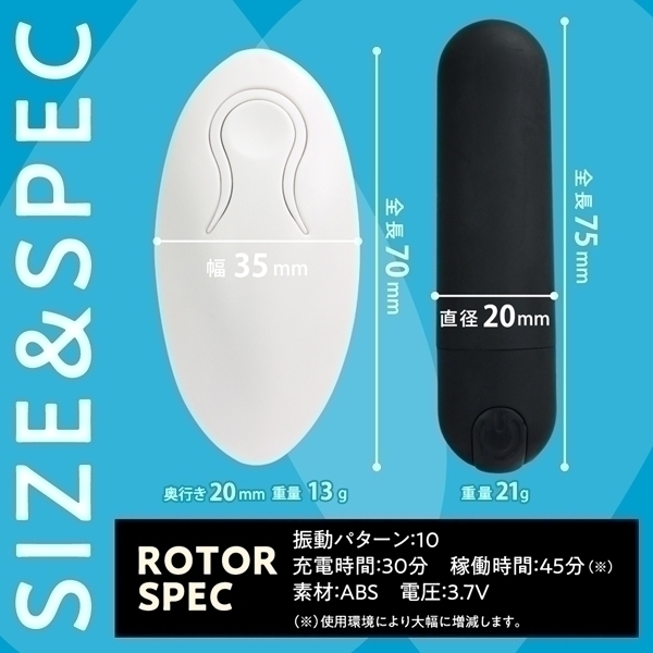 パッケージ:ヘッダー14.5×8.8×3.0cm ローター 7.5×直径2.0cm リモコン 7.0×3.5×2.0cm USB充電式