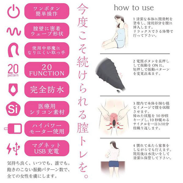 いつでも誰でも、ずっと気持ちイイ♪膣圧を向上して『極上名器』に変身させる膣トレグッズ「ウェービーオルガ ブラック」。膣壁に密着するウェーブ形状のデコボコした表面の構造が、男性を虜にする名器に変身させます。こまめに挿入してトレーニングすることで徐々に膣圧アップ!取り出しやすいスマートな取っ手は邪魔にならないので、普段の生活をしながらでもトレーニング可能。強さが選べる20種類もの振動パターンを搭載!ボタン一つの簡単操作で異なる刺激を堪能できます。また、トレーニングだけでなくクリバイブとしても快感を得られるハイパワーモーター仕様です。本体の充電は簡単なマグネット式USB充電(専用ケーブル付属)、完全防水仕様、医療用シリコン製。